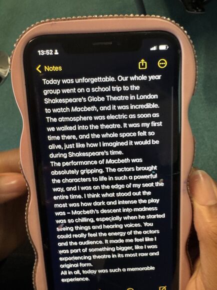 On 10th March, our Year 8 students had the exciting opportunity to watch Macbeth at Shakespeare’s Globe. Seeing the play performed in its traditional setting, with a modern twist, brought their studies to life in a way that only live theatre can. The experience deepened their understanding of the tragedy, and they were thrilled to witness the drama unfold right before their eyes.